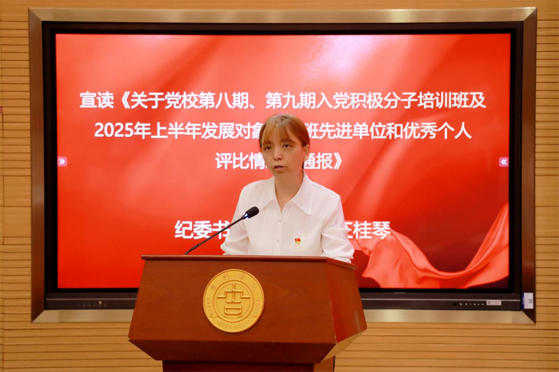 大会在雄壮的《中华人民共和国国歌》声中拉开帷幕。校纪委书记、副校长王桂琴宣读了《关于党校第八期、第九期入党积极分子培训班及2025年上半年发展对象培训班先进单位和优秀个人评比情况的通报》。她勉励全体学员以此为起点,持续加强理论武装,筑牢信仰之基。这不仅是对过去一段时间党校培训工作的全面总结,更是对一批在理论学习、实践锻炼中表现突出的分校集体和优秀学员的充分肯定。