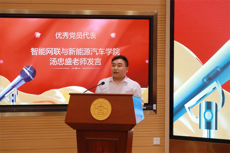 智能网联与新能源汽车学院的优秀共产党员代表汤忠盛老师发表了真挚感言。他深情回顾了自己作为一名党员教师,如何在党的教育方针指引下,将教书育人与科研创新紧密结合,在专业建设、人才培养和技术攻关中勇挑重担、攻坚克难的经历。他动情地说:“党员身份不是光环,而是沉甸甸的责任。立足三尺讲台,深耕专业领域,为国家培养更多高素质技能人才,就是我对党忠诚的最好诠释。”他的发言朴实无华却充满力量,展现了新时代教师党员的责任担当与教育情怀。