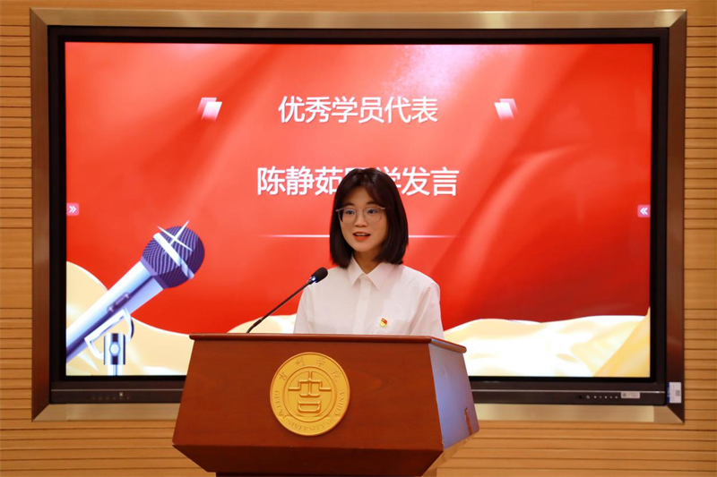 优秀学员代表陈静茹同学登台发言。她结合自身在党校学习的深刻体会,动情讲述了党的创新理论如何照亮青春理想、端正入党动机的心路历程。她表示,通过系统学习,更加深刻地理解了党的性质宗旨和肩负的历史使命,坚定了为共产主义奋斗终身的信念。她代表全体学员郑重承诺,将以此次结业为新的起点,时刻以党员标准严格要求自己,在学习和生活中发挥先锋模范作用,争取早日加入党组织。