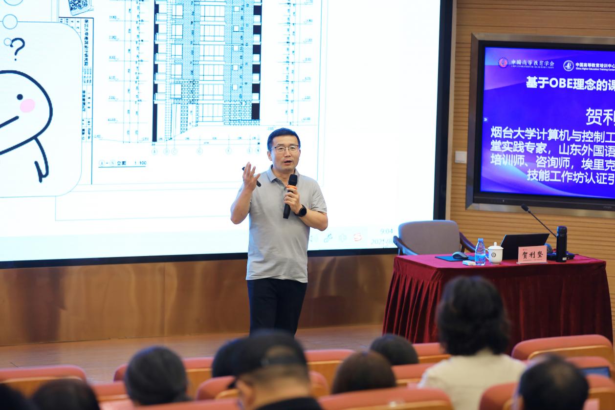 烟台大学计算机与控制工程学院副教授、翻转课堂实践专家贺利坚带来《基于OBE理念的课程教学大纲设计》专题培训。他以“目标—评价—活动”三位一体的设计模型,结合20余年的教学改革实践,指导教师如何将毕业要求反向推导为课程目标,如何以可观察行为动词精准表述学习结果,并现场演示了评价量规的设计与应用。