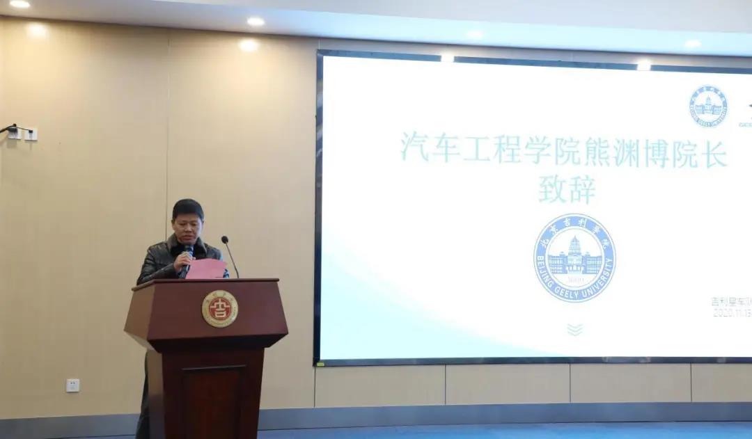 汽车工程学院院长熊渊博回顾了北京吉利学院吉利星车队的发展历史。吉利星车队是一支专业性强的学生实践团队,自2008年成立以来,代表学校参加10余次全国性重要赛事,取得了骄人的成绩,为我校赢得了许多荣誉。熊院长表示,吉利星车队历届成员勤奋学习、积极探索、潜心钻研、精心设计、科学制作,不断创新发展,在老师的精心指导下,采用碳纤维车身制造技术,自主研发的赛车荣获第六届本田节能车大赛北京地区ev组第一名,充分展示了我校吉利学子团结拼搏、奋发有为的精神面貌及学生专业社团创新进取的时代风采。