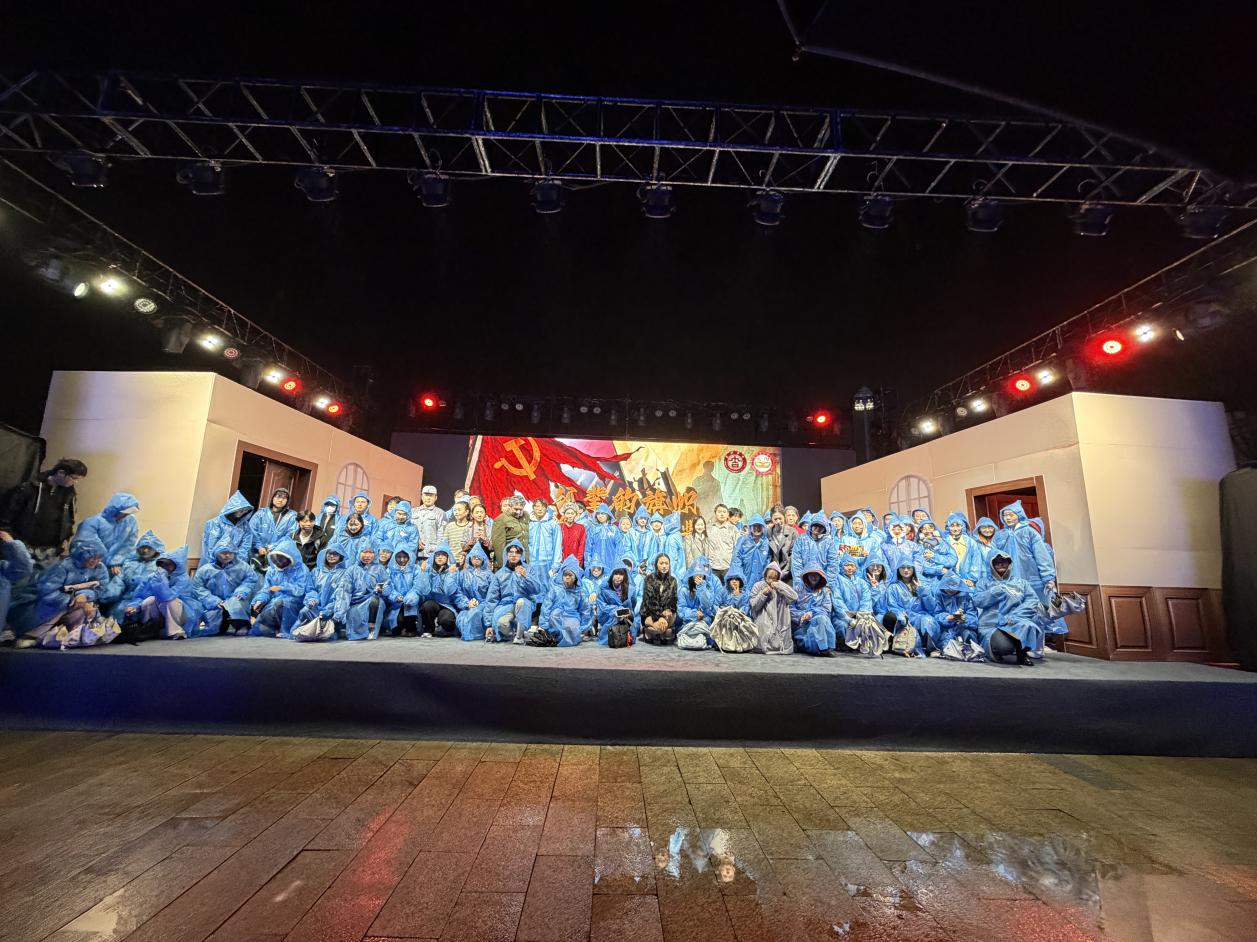“演!雨下得再大都演!”公演首日,雨势越下越大。台下观众没人离场,纷纷穿上雨衣、举起手机记录;后台的学生们,趁着间隙反复核对道具、默念台词,没人抱怨一句。直到雨势渐大,院长果断决定暂停,却仍有学生小声问:“我们能再等等吗?想把最好的状态演完。”
