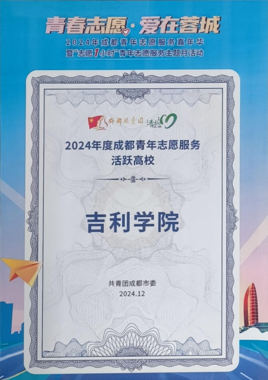 2024年12月19日我校荣获“2024年度成都青年志愿服务活跃高校”称号