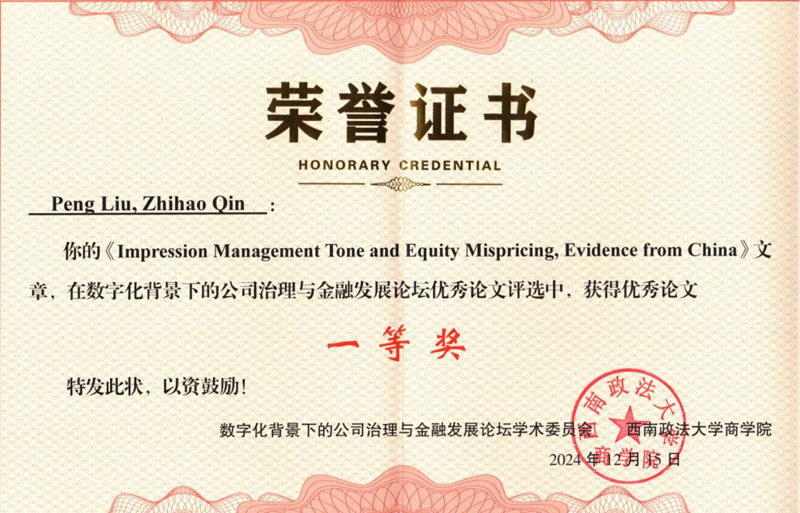 2024年12月20日我校教师荣获数字化背景下的公司治理与金融发展论坛 优秀论文一等奖