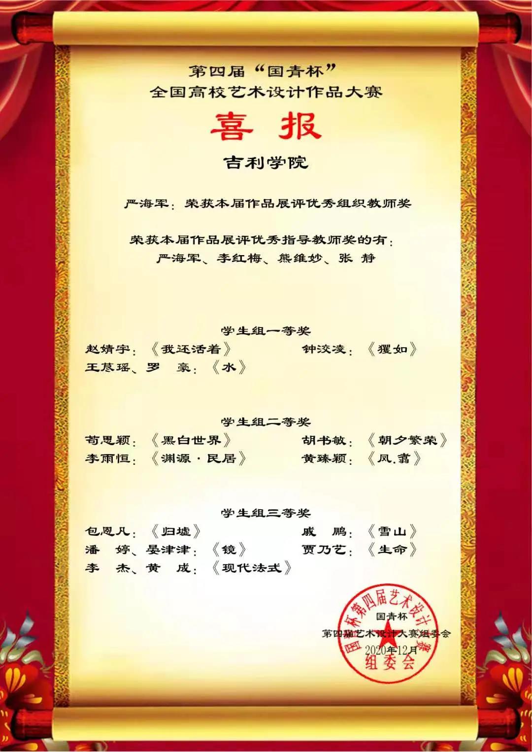 2020年12月26日吉利学院师生在第四届“国青杯”全国高校艺术设计作品大赛中斩获17个奖项